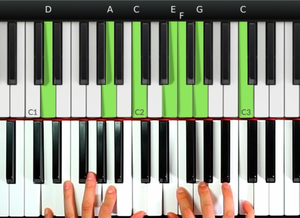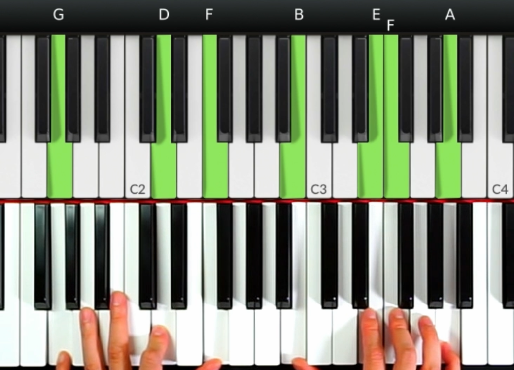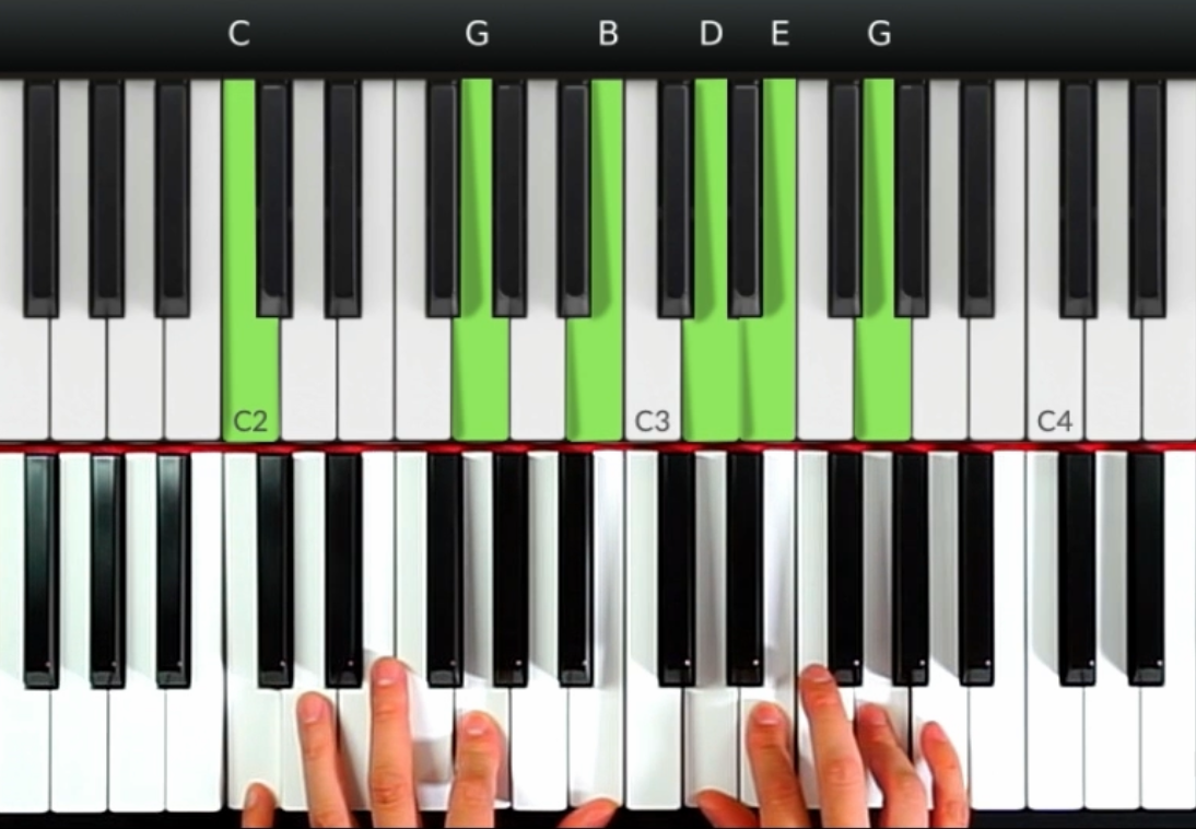 Cmaj7:在C和弦中加入大七音(B音),左手彈根音和五音,右手彈2音、3音、5音。