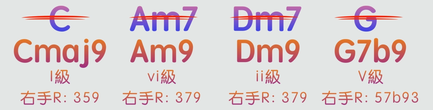 這是最基礎的彈法,但我們可以通過一些技巧,讓這些和弦聽起來更加高級。