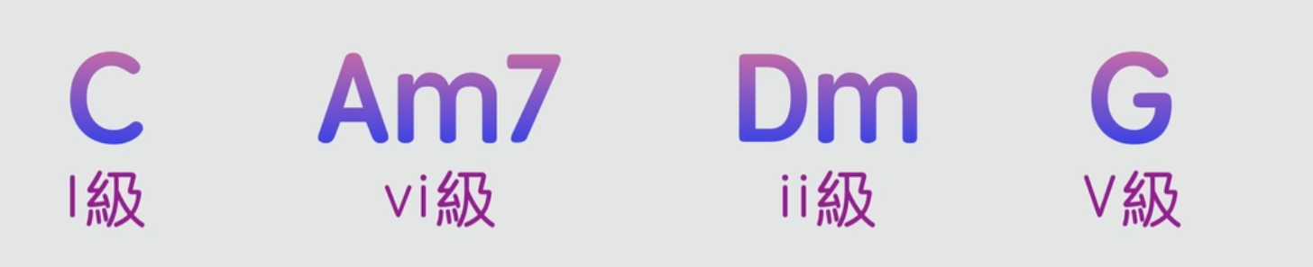 一級和弦(C和弦)到六級和弦(Am7和弦)