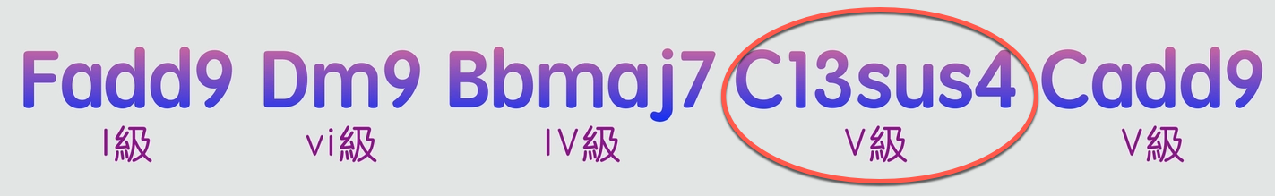 我們也可以在Bbmaj7 (IV)過渡到Cadd9 (V)的時候,加入一個五級掛留和弦(V),就是C13sus4.