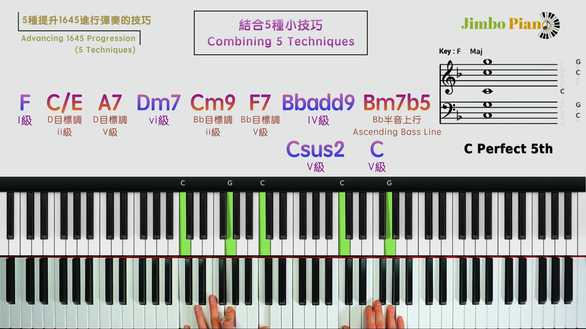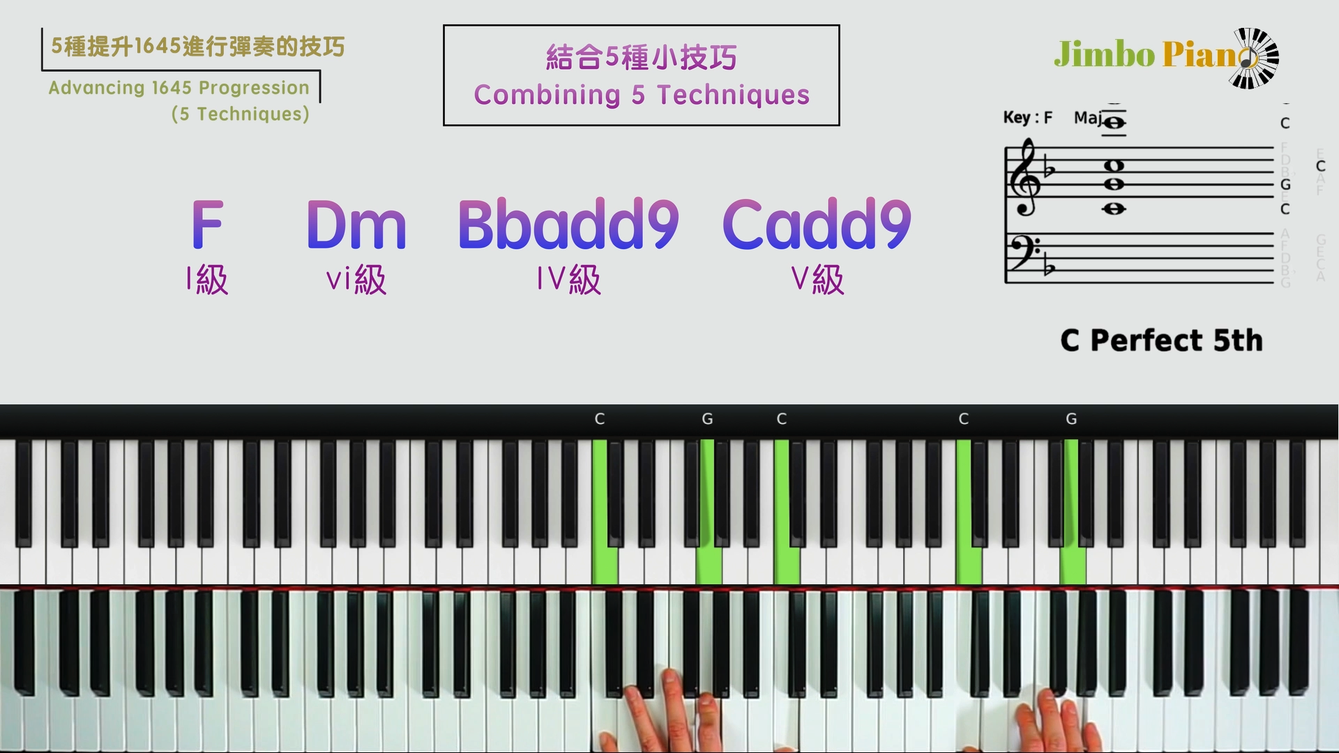 現在我們來結合以上所學到的5種小技巧,來做一個彈奏示範。讓大家可以看到如何將一個簡單的1645和弦進行,通過這5種小技巧,令彈奏變得高級起來。