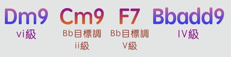 從Dm9 (vi)過渡到Bbadd9(IV)的時候,我們同樣可以加入251和弦進行,以Bb作為一個調,它的ii級和弦可以是Cm9,V級可以是F7.