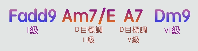我們可以加入251過渡和弦。比如,從Fadd9(I)去到Dm9(vi)的時候,中間可以加入以D作為一個調的ii級和V級和弦,就是Am7/E和A7和弦。