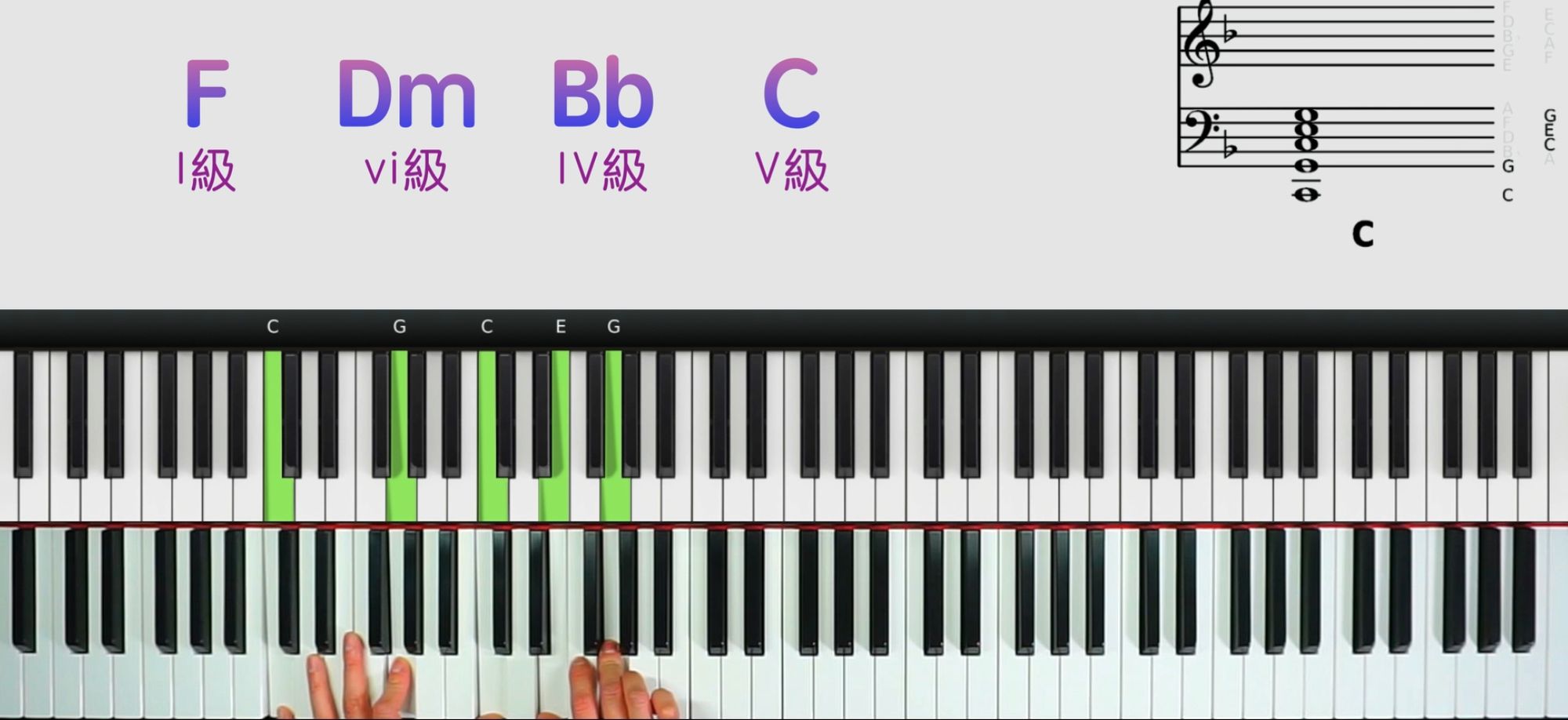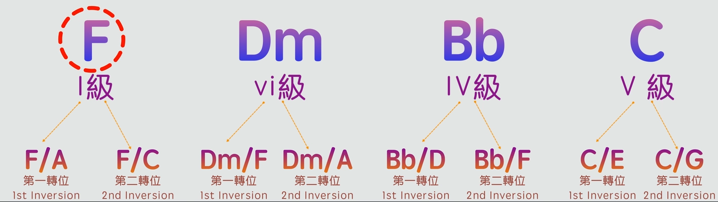 在彈奏和弦進行(比如1645)的時候,我們的右手就可以上行地彈奏轉位和弦。比如F和弦(I),它的第一轉位是F/A,第二轉位是F/C。以下就是1645和弦進行的轉位和弦圖解。