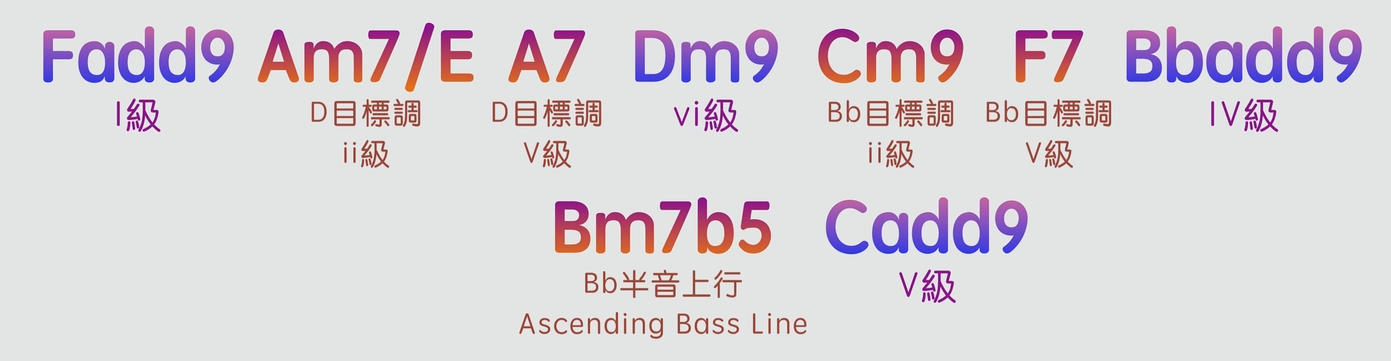 從Bbadd9(IV)過渡到Cadd9和弦的時候,可以用Bb得半音上行的B半減七和弦(Bm7b5)來過渡到Cadd9.