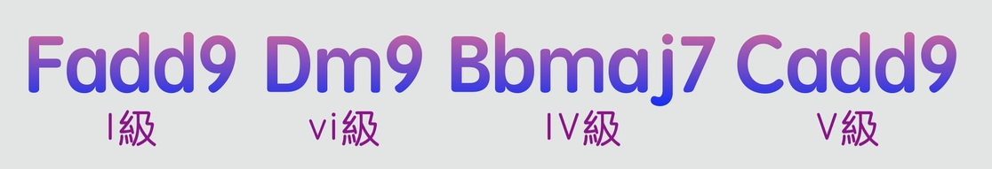 在F調的1645和弦進行裡面,如果我們適當地加入9音的話,那麼和弦進行就可以變成一下這樣子。