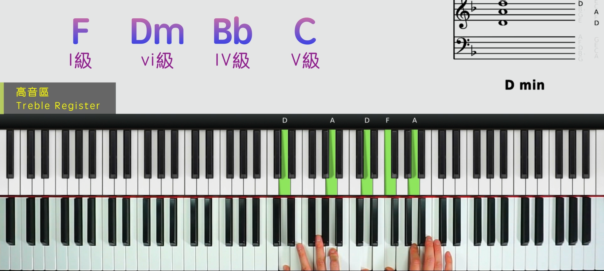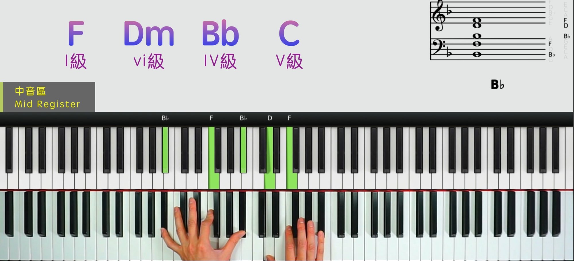 以F調的1645和弦進行作為例子,用柱式和弦來彈奏。我們可以在低音區來伴奏,慢慢地用沈穩的低音來烘托歌曲的感情.