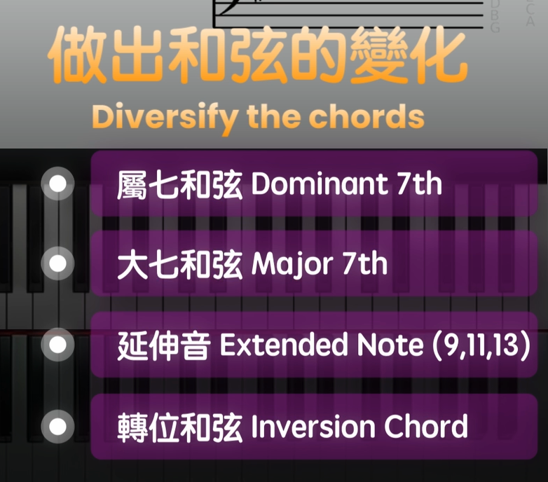 第三種小技巧就是我們彈奏的時候,需要對和弦做出不同的變化,譬如屬七和弦,大七和弦,延伸音,轉位和弦等等。
