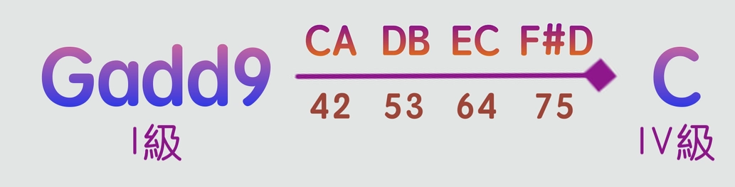 那麼六度音該如何彈呢?在這裡我們可以在彈完I級和弦Gadd9後,馬上做出四對六度音的上行彈奏:4音和2音,5音和3音,6音和4音,還有7音和5音。