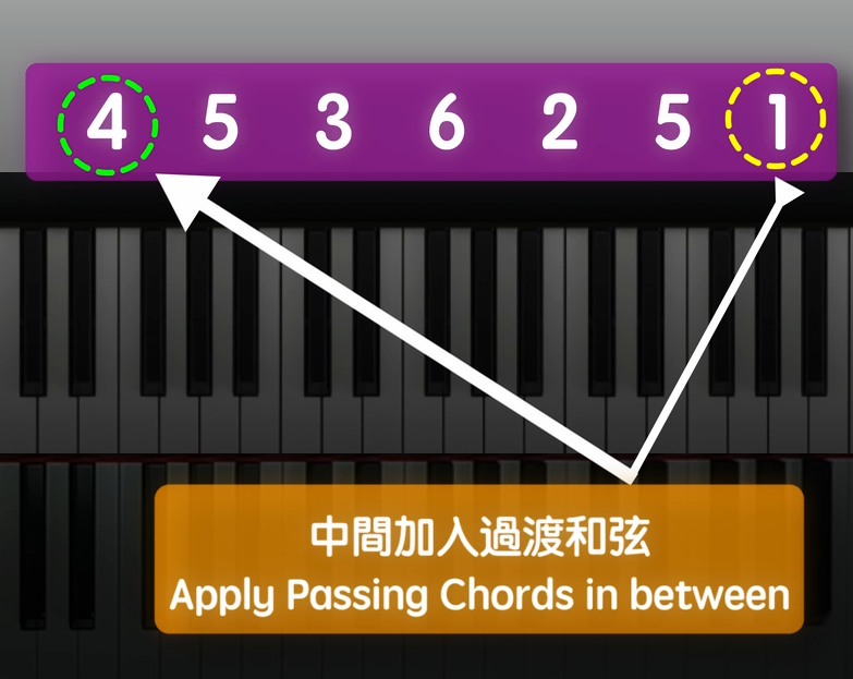 第四種小技巧就是在彈完最後的I級和弦,準備重新回到4536251和弦進行的四級和弦的時候,中間可以加入一些過渡和弦。在這裡有兩個小技巧可以學習。