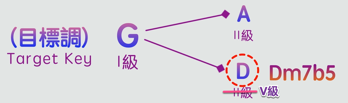 為什麼我們可以這樣彈呢?我們以G作為一個目標調,那麼G調的ii級和V級分別為A和D,而我們就可以運用251過渡和弦的原理,把V級和弦用在G - C的和弦過渡當中。
