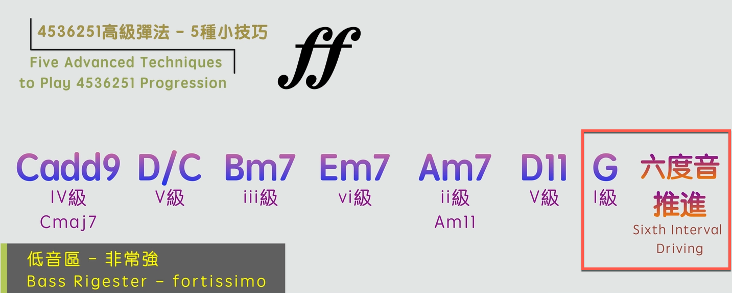希望這個4536251和弦進行的五種高級彈奏小技巧的小課程,能夠幫助大家有效地提升和弦進行彈奏。其實提升和弦進行彈奏的小技巧,遠遠不止這五種。但如果大家能夠掌握好今天所學習的這5種小技巧,我想你的彈奏馬上會提高到一個新的檔次!我會以後的文章誌裡面,繼續分享更加多關於和弦進行的高級技巧。