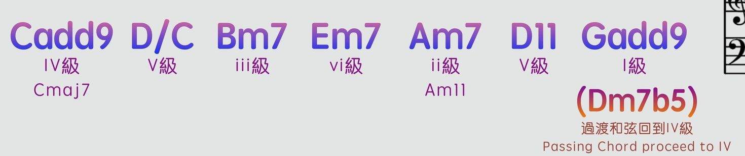 我們來看看如何應用在和弦進行裡面:比如IV級和弦C可以被替代為Cadd9來彈奏(延伸9音)。V級和弦D可以被替代為轉位和弦D/C,iii級和弦Bm7可以用Bm9來代替。當加入和弦變化之後的4636251和弦進行,就會是以下這樣子,和弦進行的高級感馬上就出來了。😎