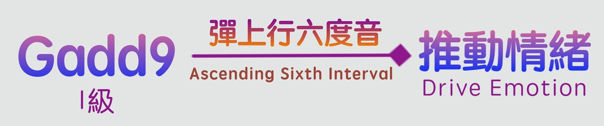 小技巧2: 當彈完一級和弦Gadd9的時候,我們可以用上行六度音的彈奏來推動情緒。