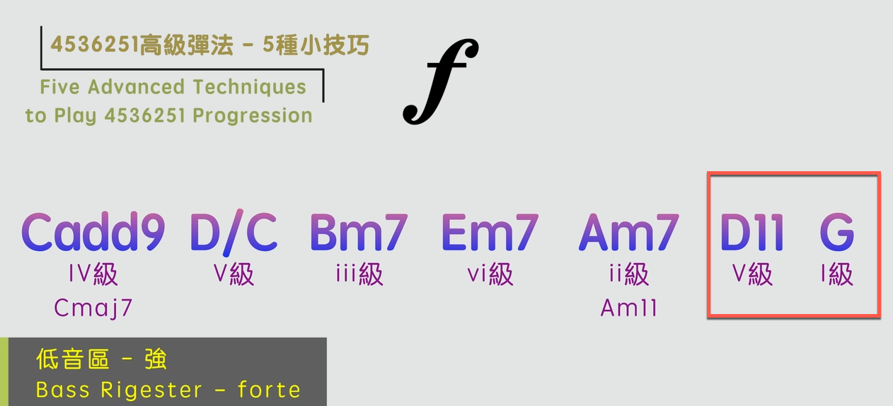 到了V級和弦和I級和弦的時候,就可以用強力度在低音區(f)彈奏。
