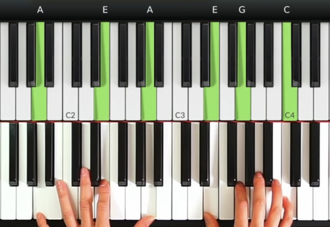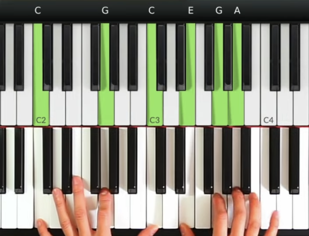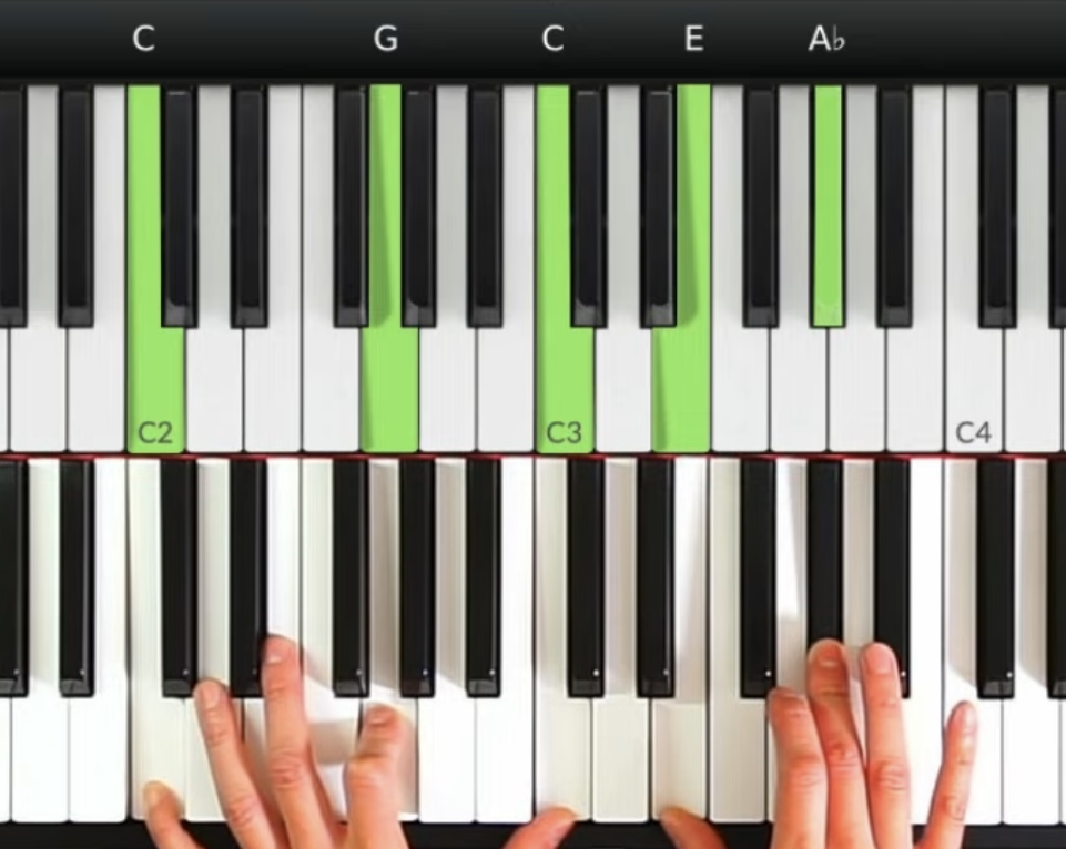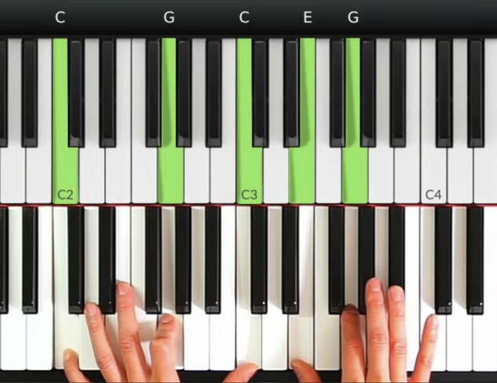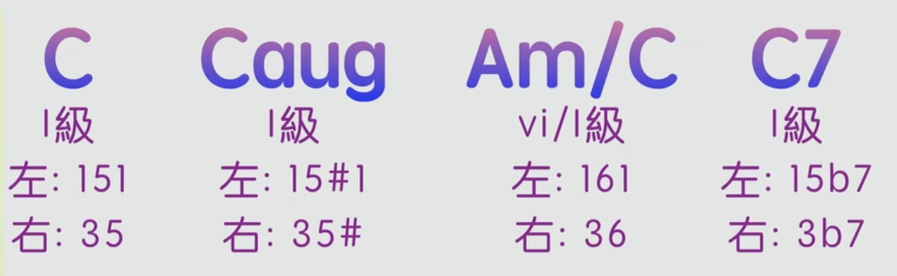 第一個和弦: C和弦(根-五-根)配合右手的3音和5音