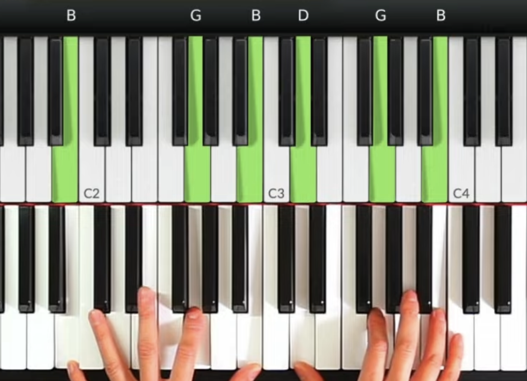 G/B和弦: 這是一個轉位和弦, 低音從A上行到B, 創造流暢的低音線條, 而且保持在調內和弦
