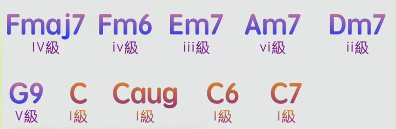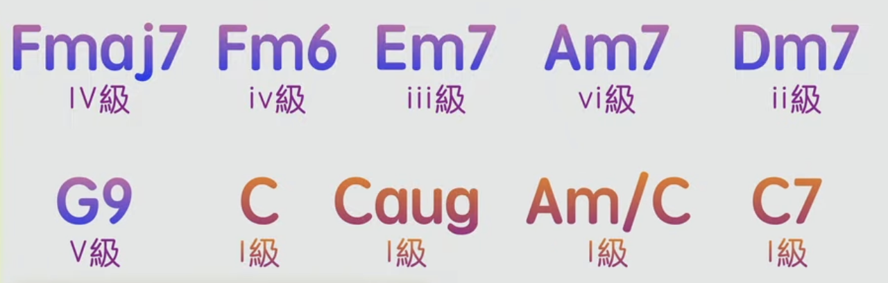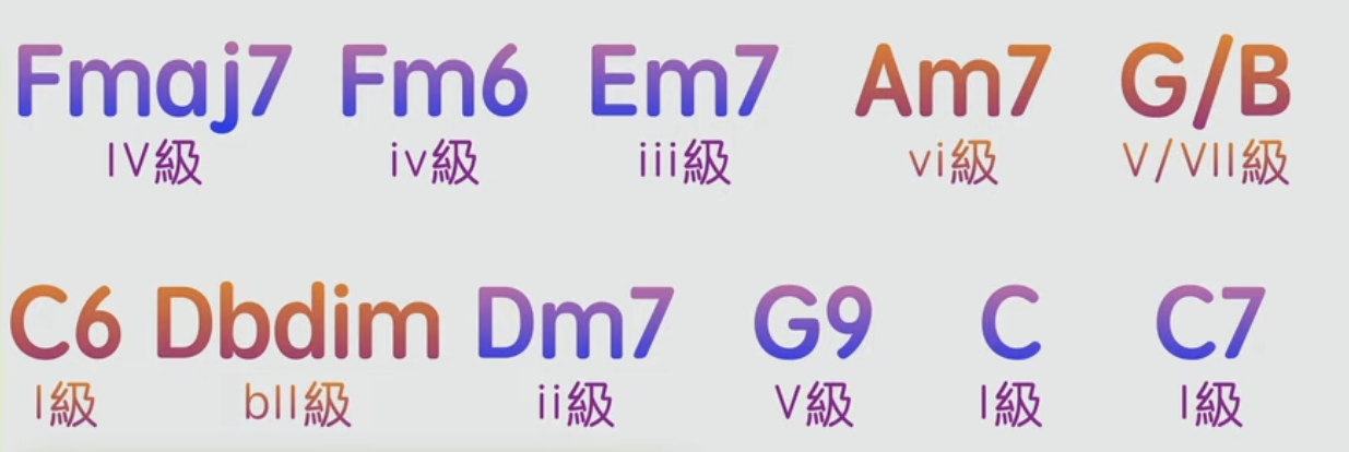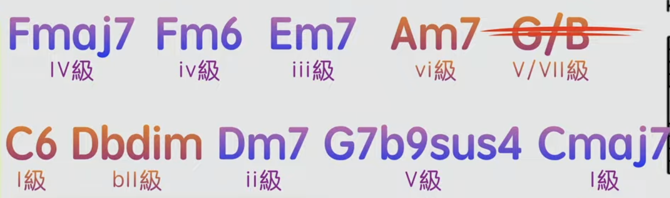Am7(六級和弦) → G/B(五級轉位) → C6或Cmaj7(一級) → Dbdim(半音過渡) → Dm7(二級)