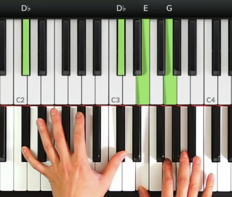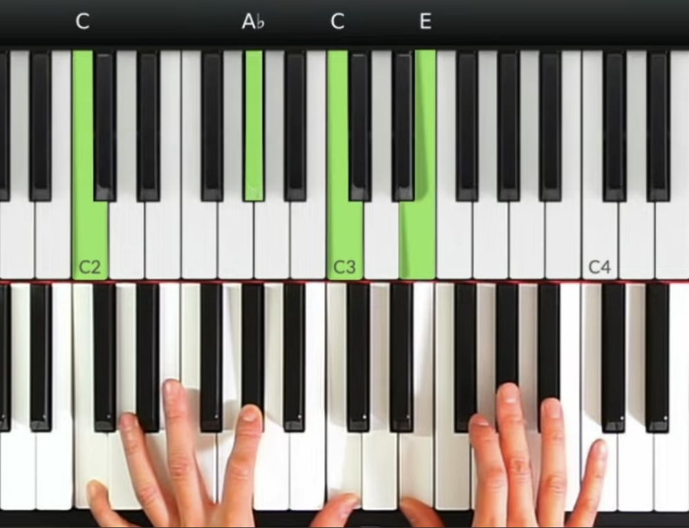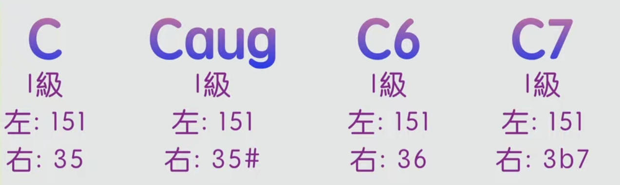 第二個和弦(C增和弦): 左手可以彈奏根音-Ab-C, 直接反映出增和弦的特性