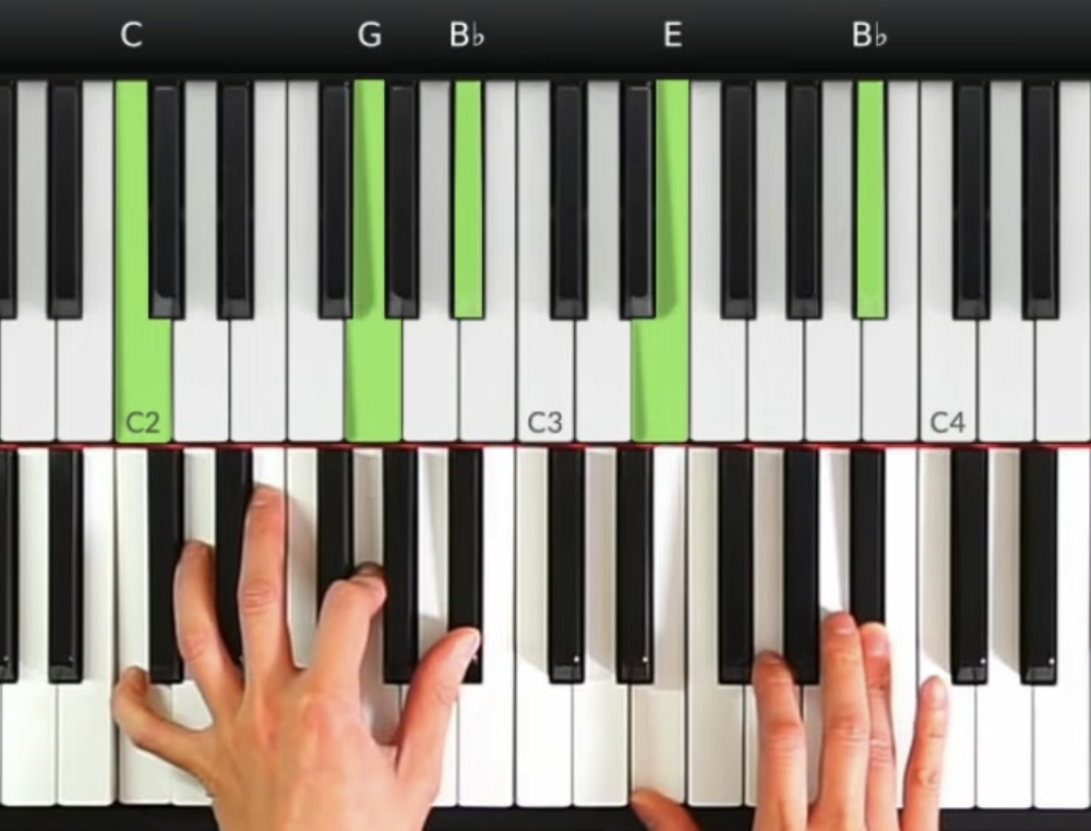 第四個和弦(C7): 左手改為根音-5音-小7音的結構