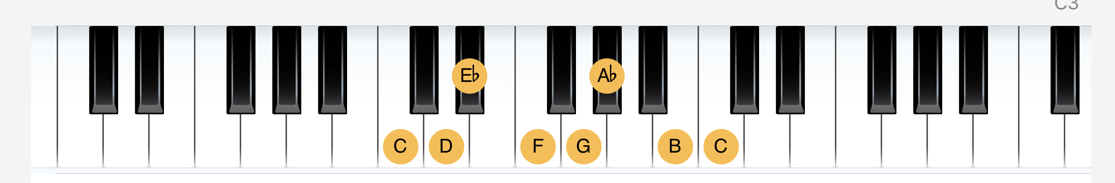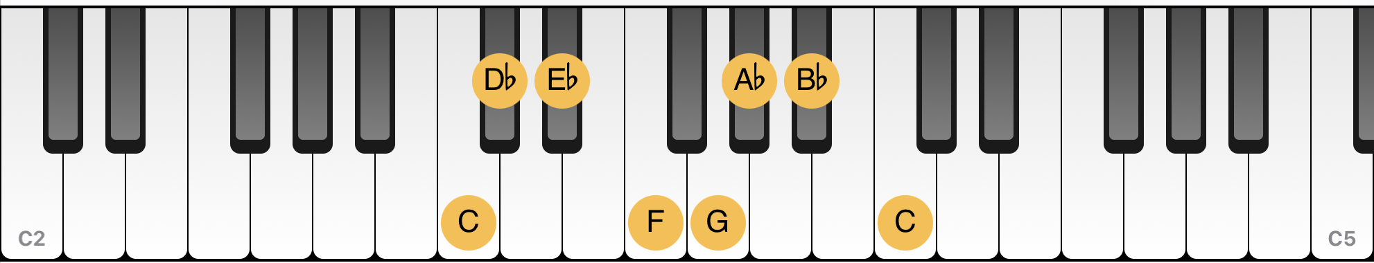 C 大調是全白鍵。C 的同主音小調,則相當於 Eb 大調音階(包含 Eb、Ab、Bb 等黑鍵)。