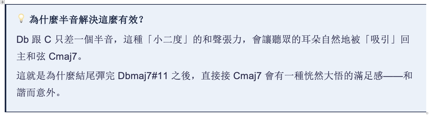 彈完這個和弦,C 自然地成為「下一站」的根音——這就是為什麼 Dbmaj7#11 → Cmaj7 的解決感這麼強烈。