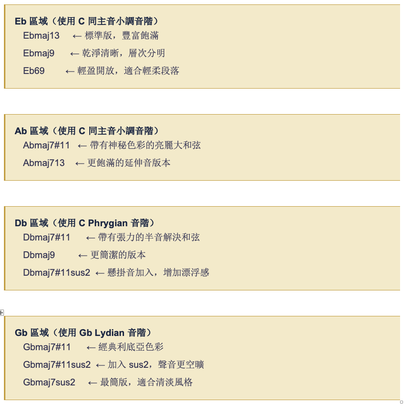 只要你待在對應的音階裡面,同一個和弦區域有很多不同的和弦可以替換,讓音色更豐富。以下是一些常用的替換選項:
