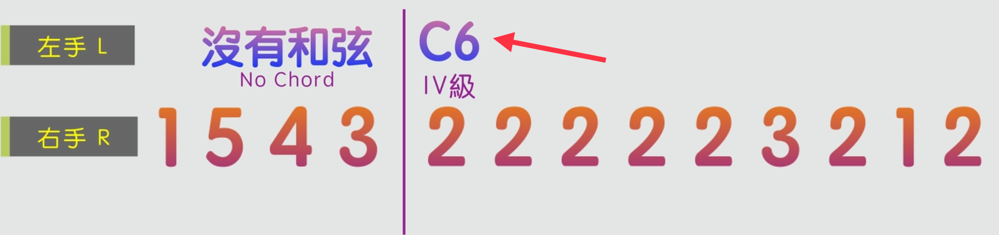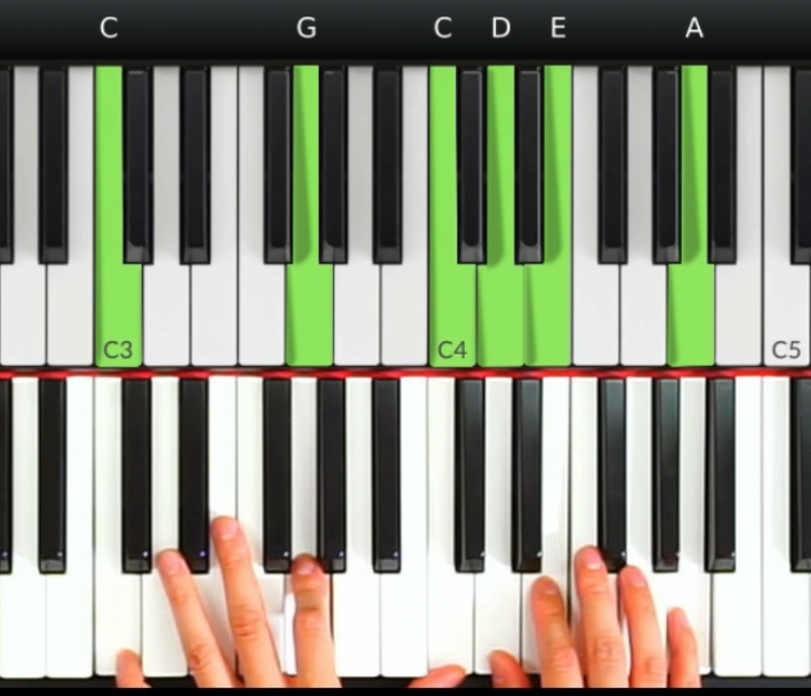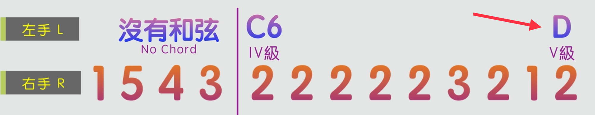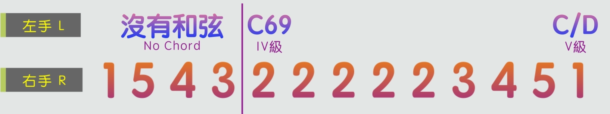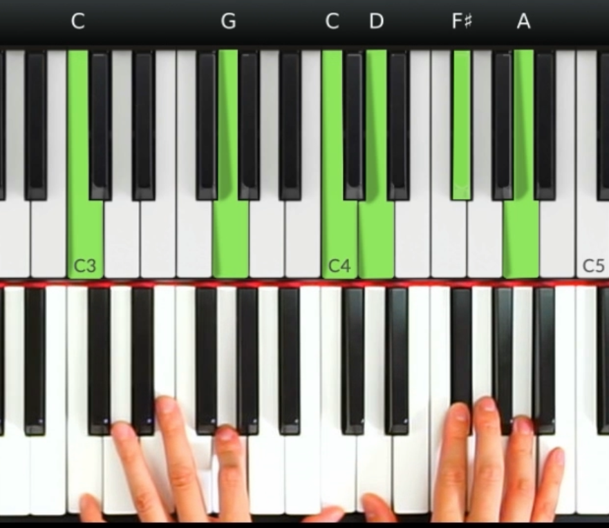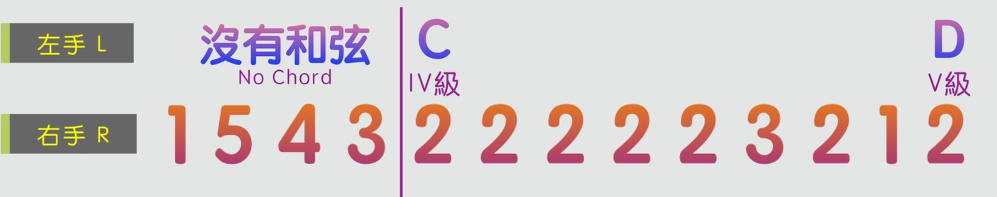 第一兩小節,左手在前四個旋律音的時候不需要彈奏和弦,後面就根據旋律音來彈奏C和D和弦。