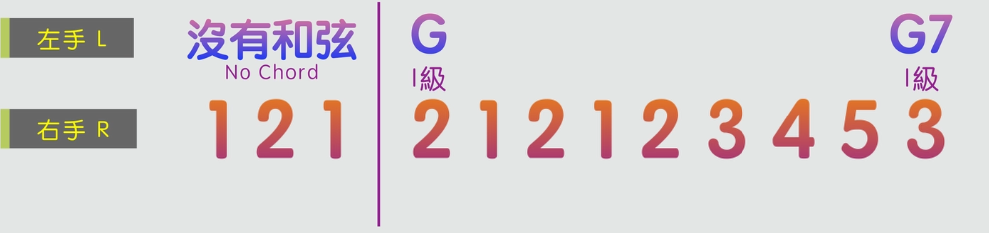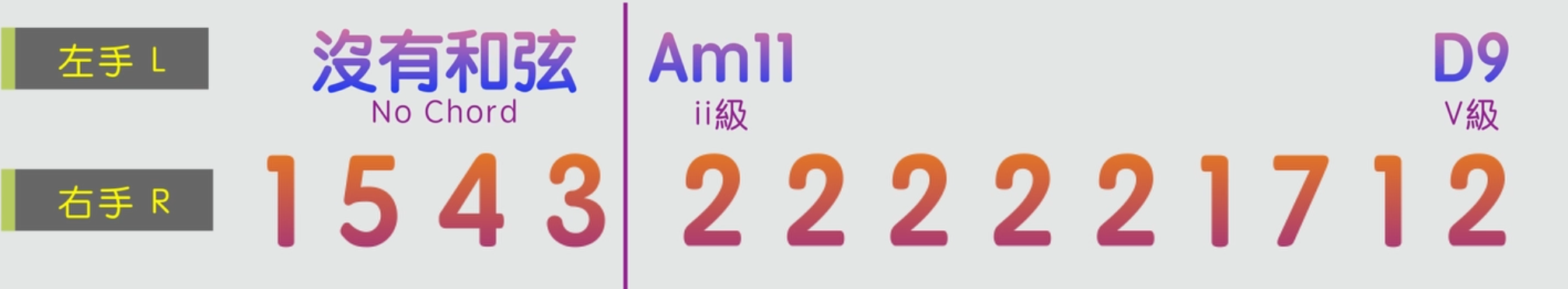 以4/4拍為例,右手我們彈的即興旋律音是G大調音階裡面的1543222223212,也就是GDCBAAAAAABAGA.