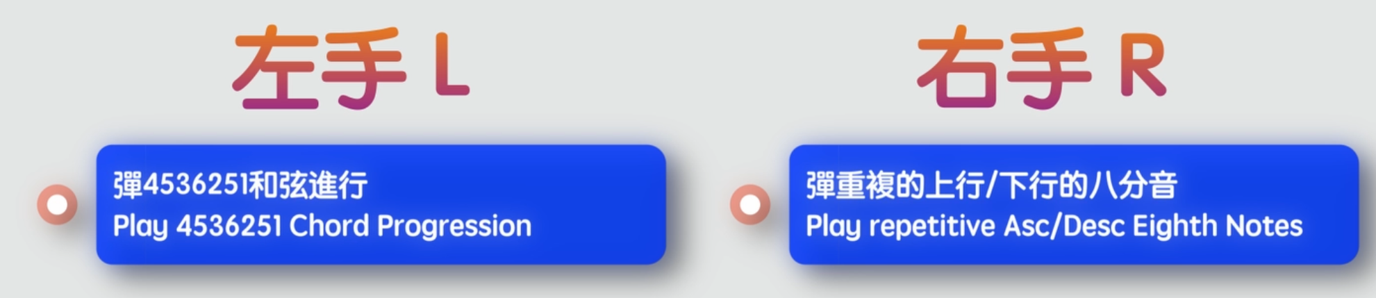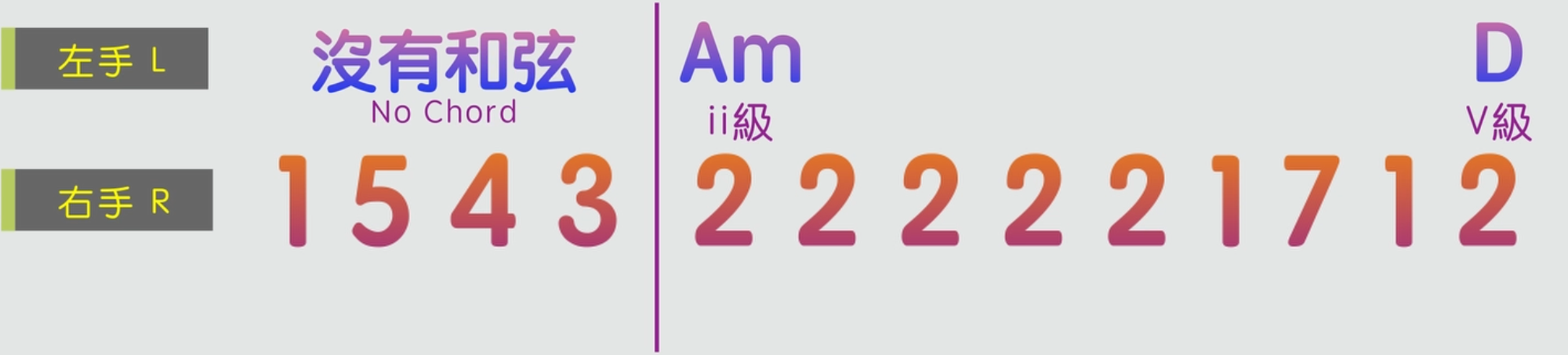 大家有沒有發覺, 這一連串的右手旋律音都是在就近音區裡面上行或者下行彈奏的音,也是我剛才提及到的第一種右手彈奏的方法。左手我們就彈4536251的和弦進行,那怎麼彈呢?