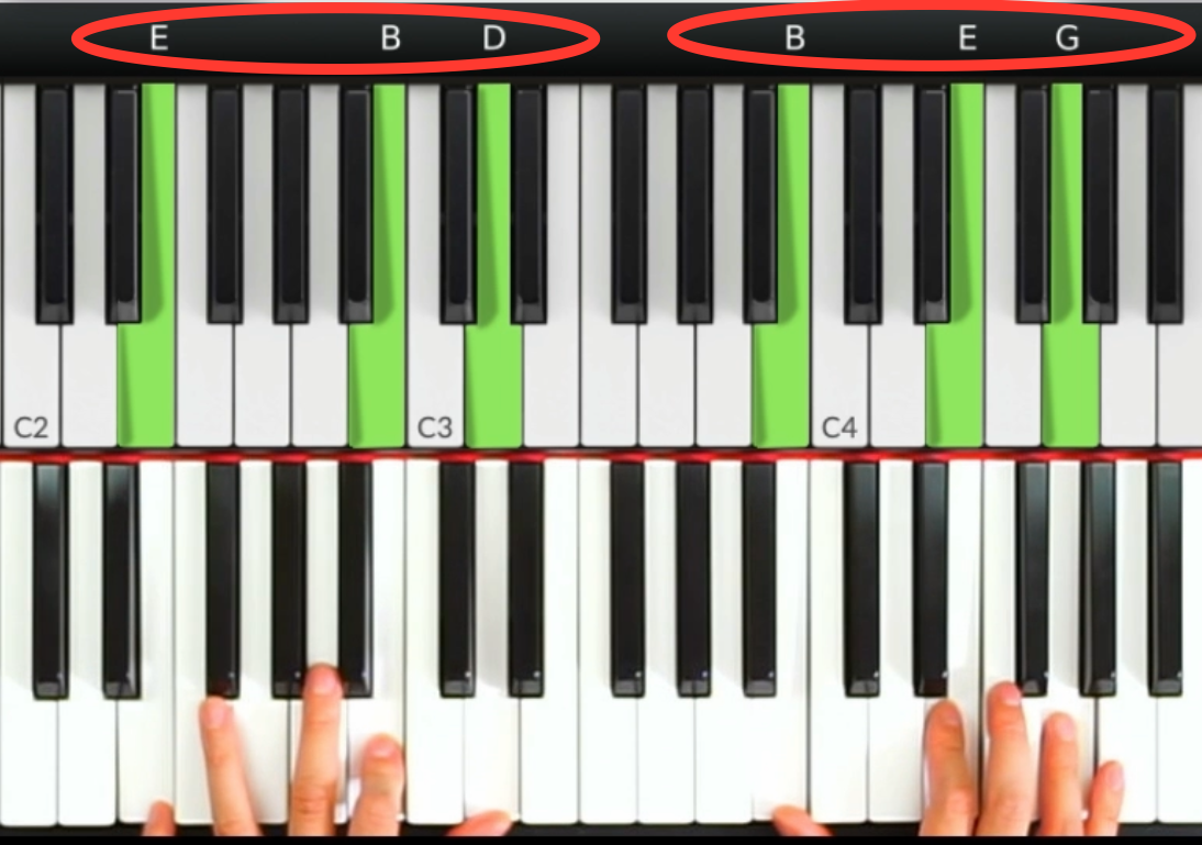 再舉一個例子,Em7和弦,我們也可以左右手一起來用小琶音的方式來彈奏和弦組成音。左手彈E B D琶音、右手彈B E G琶音