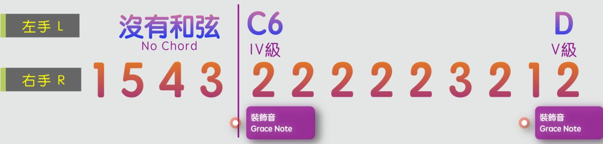 首先我們來學習一下裝飾音,裝飾音通常會依附在音符上很快地連接到下一個音。比如我們彈奏C6和弦的時候,右手在彈奏A音之前,會很快地彈一個裝飾音G,來過渡到A音