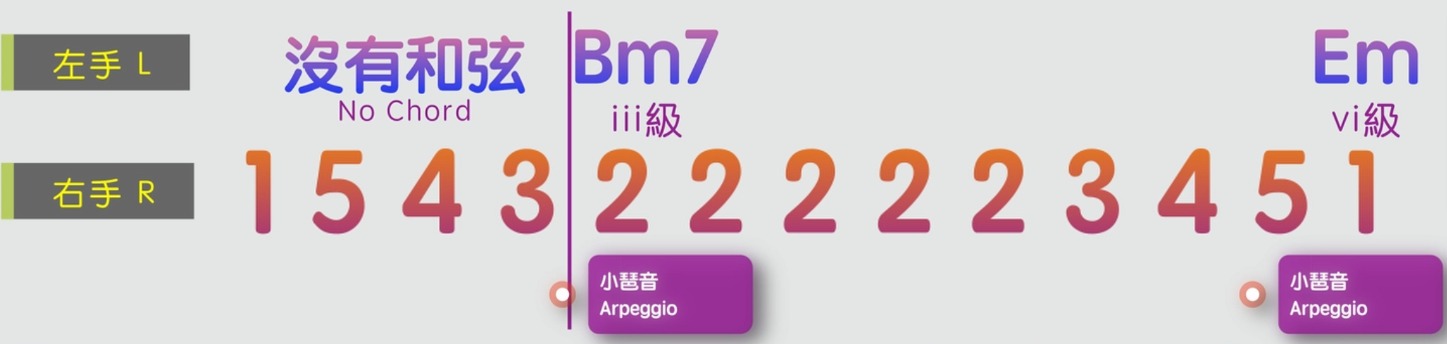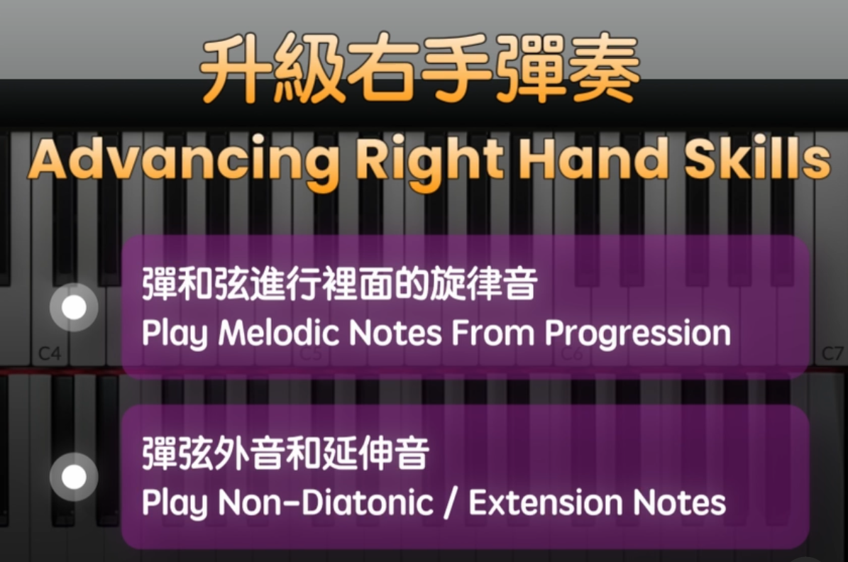 第二個步驟我們需要去升級我們的右手彈奏,不能夠僅僅地彈單音了,需要去彈和弦裡面的旋律音,或者弦外音和延伸音。
