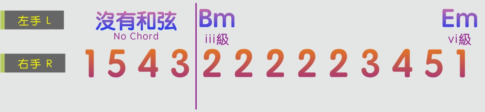 我們的左手需要開始去加入和弦了。同樣前面的四個旋律音不需要和弦彈奏,後面就根據旋律音來加入Bm和Em和弦。