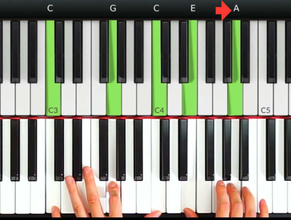 有一個很重要的技巧,就是當右手彈奏和弦音的時候,最高的那個音跟旋律音是一樣的。我們來看看以下例子: 旋律音是2音 (A),所以當我們彈C6和弦的時候,右手弦內音的最高音就是2音,這樣子做能夠彈奏出和聲效果非常和諧的和弦進行彈奏。