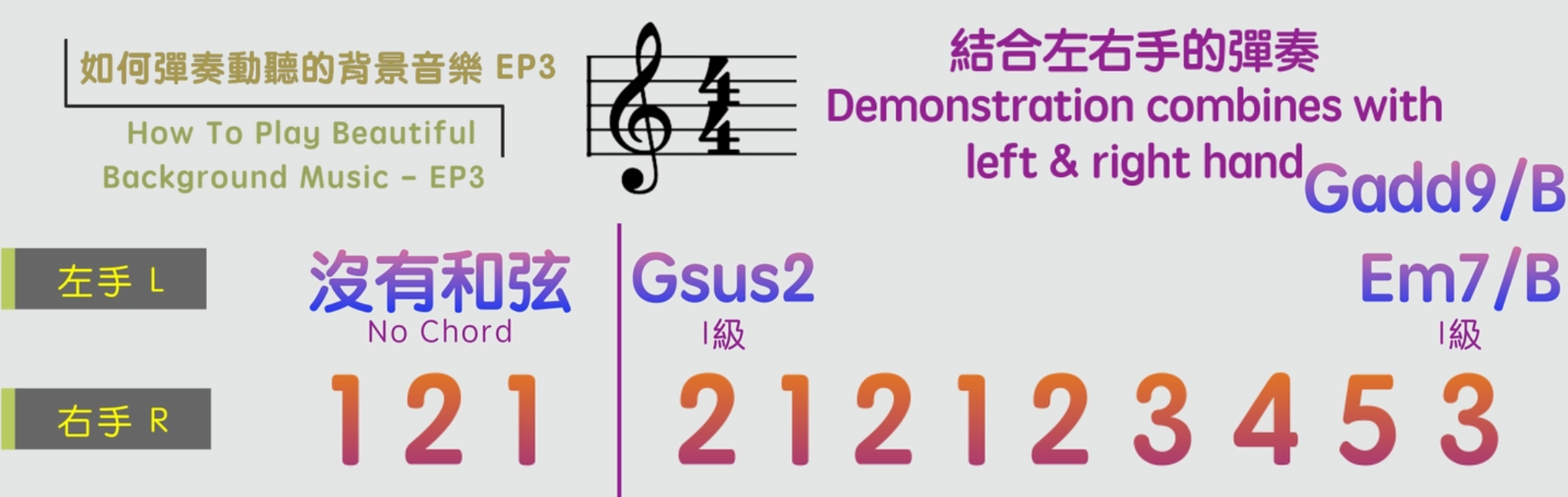 今天是學習背景音樂彈奏系列的最後一集,我們用4536251和弦進行和G調作為調式,一起來學習如何彈奏優美動聽的背景音樂。