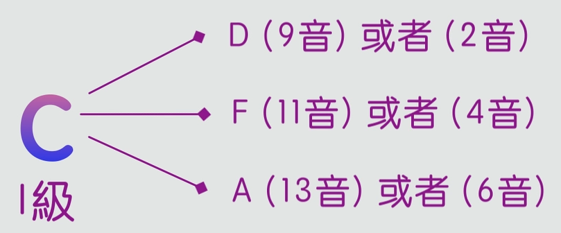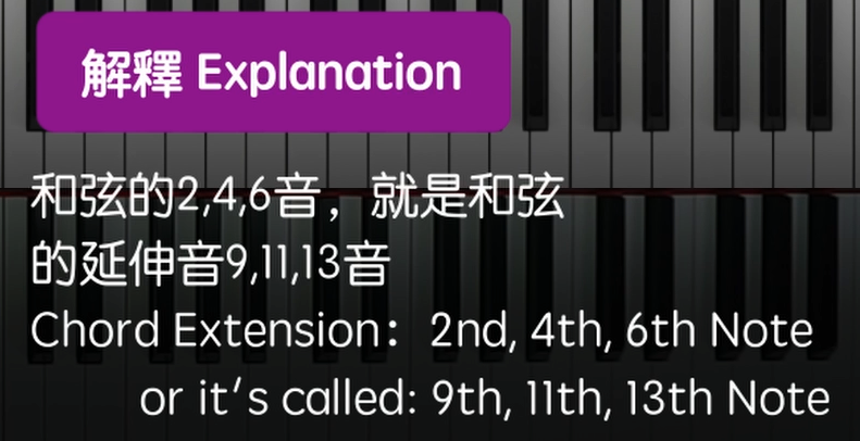 以C和弦為例,它的延伸音就是D(9音),F(11音)和A(13音)。