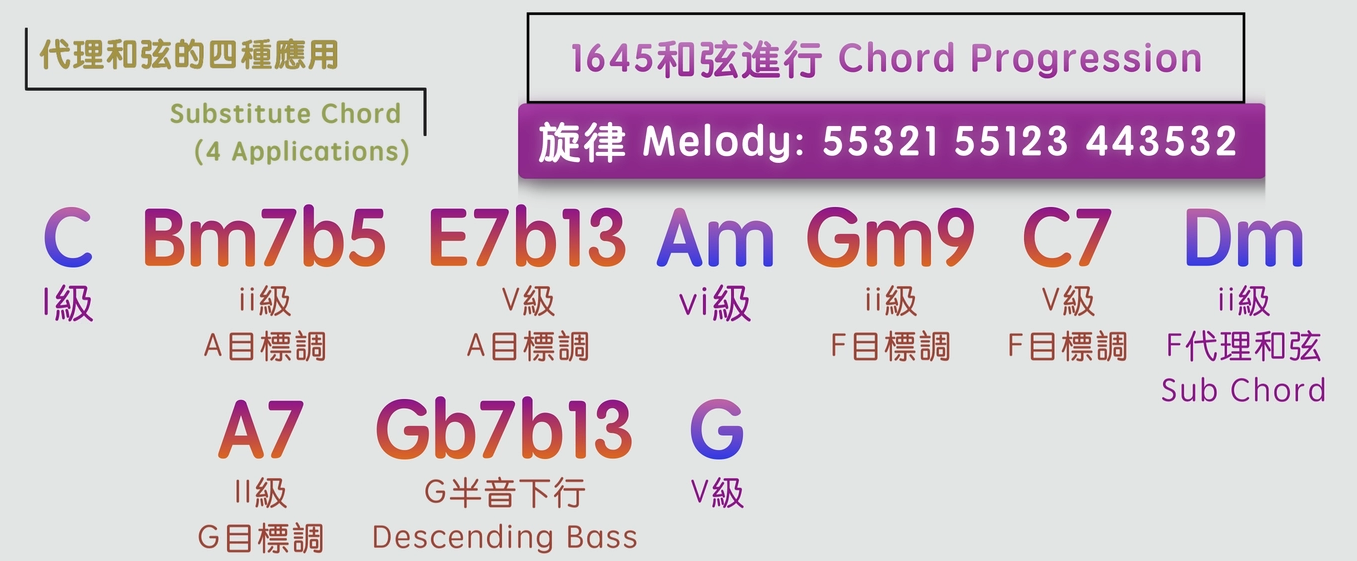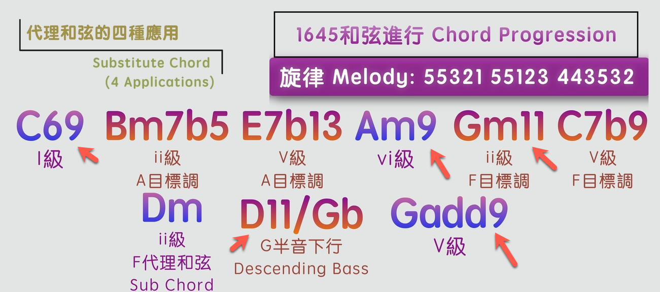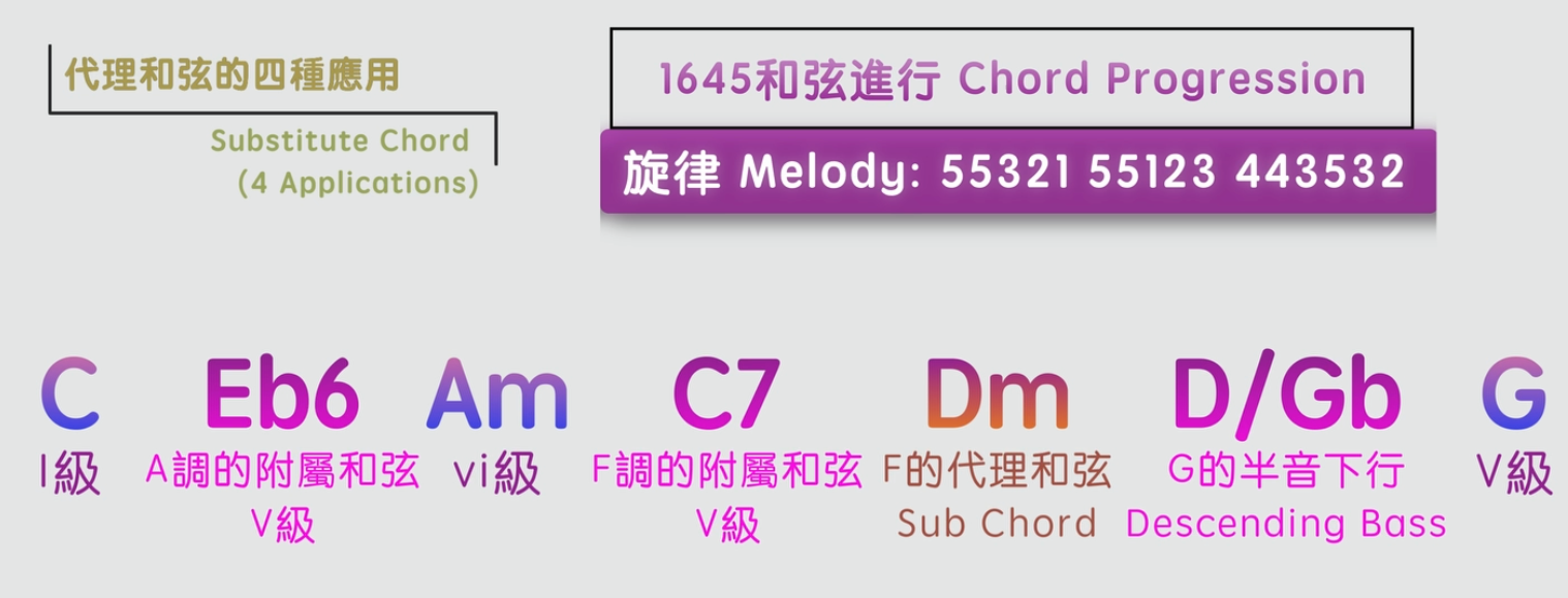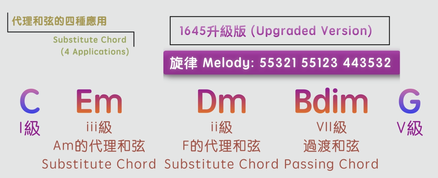 我們現在來總結一下,以文章一開始提及到的即興旋律,我們來看看加上代理和弦之後的1645和弦進行是怎麼樣的?大家可以去到Youtube視頻那裡,聽聽效果如何。