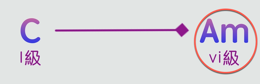 我们就以1645這個和弦進行,來進行和弦家族這個概念的應用。當C(I級)去到Am(vi級)和弦的時候,我們把重心放在Am和弦身上。