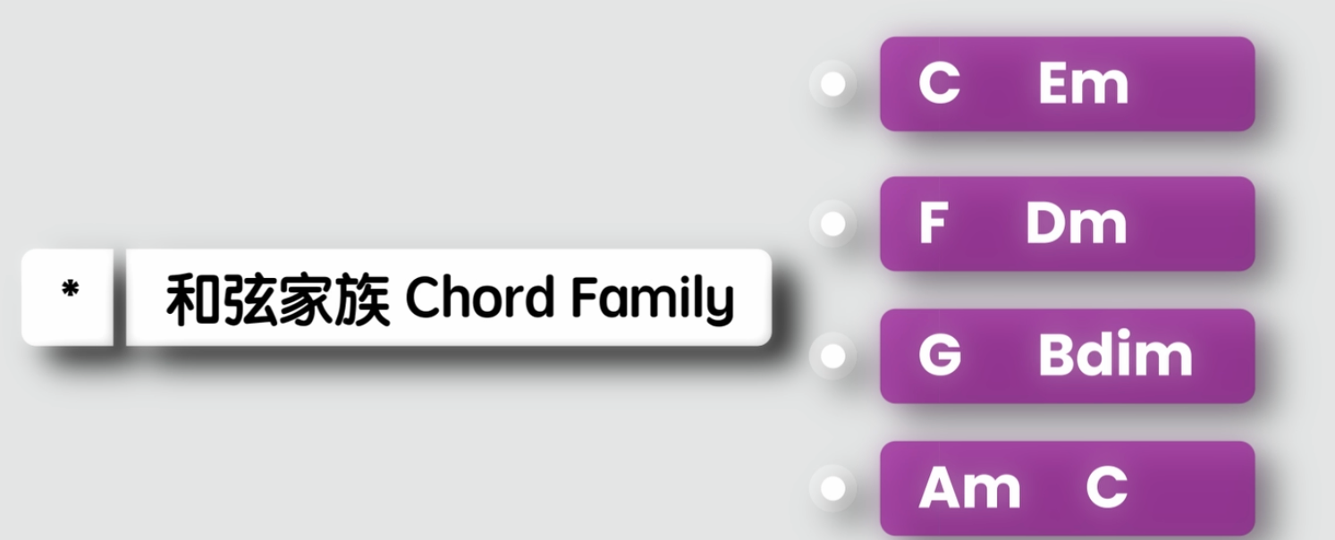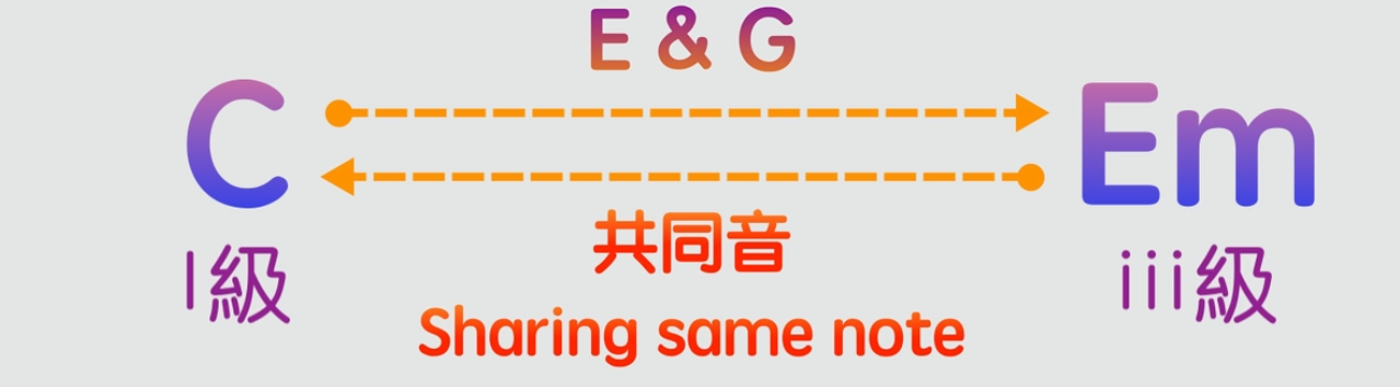 以C調為例,C(I級)和Em(iii級)的共同點,是它們有兩個共同的和弦組成音:E和G. 所以C和Em就是在和弦家族裡面了