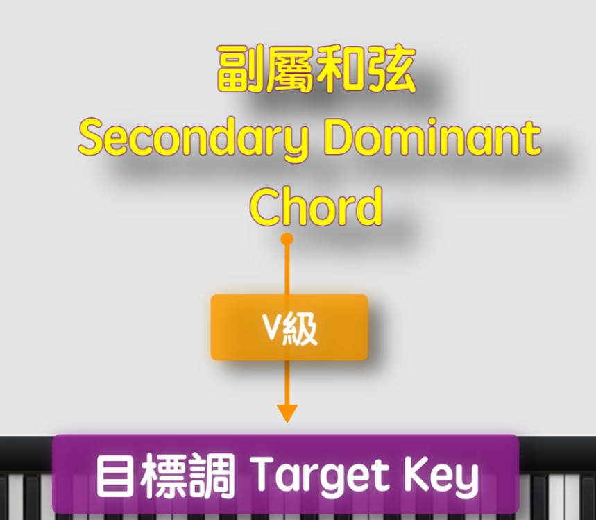 我們在第二種應用裡面,可以用到附屬和弦。什麼是附屬和弦呢?附屬和弦就是以目標和弦作為一個調, 那這個調的五級(V)和弦就是附屬和弦。