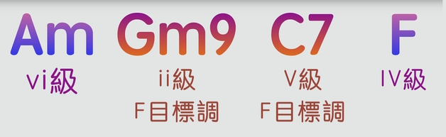 當Am(vi)過渡到F(IV)的時候,中間也可以加入251和弦進行。以F為目標調,它的ii級過渡和弦可以用Gm9,V級過渡和弦是C7(屬七和弦)。同样,我们这次可以用和弦家族的原理,用Dm去代替F,作为代理和弦。