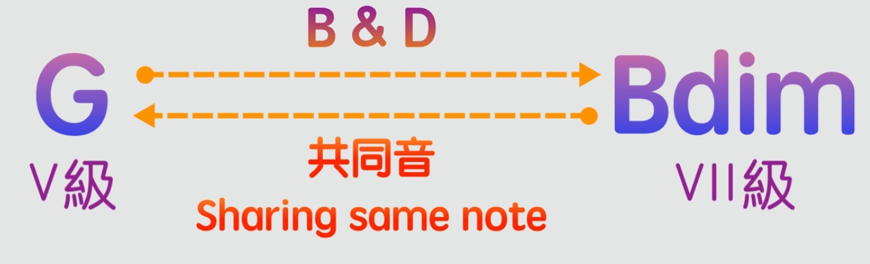 我們也可以在Dm過渡到G和弦的時候,中間加Bdim作為過渡和弦。