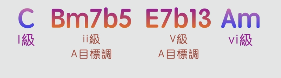 第三種是251和弦進行的應用. 這次的應用跟附屬和弦的應用非常地類似、只是加多一個二級和弦 (ii).