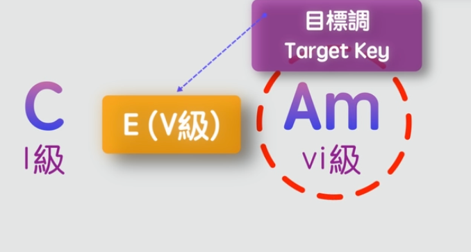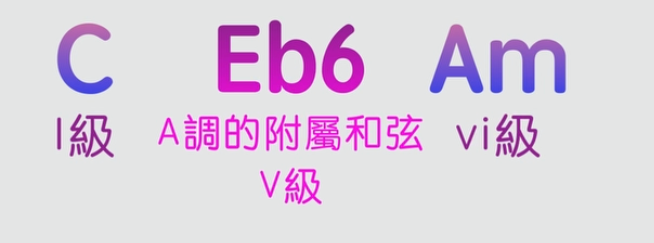 比如,從C去到Am的時候(第四拍),如果我們以Am和弦作為目標調,就是A調。那它的五級和弦就是Eb,在这里我們可以用Eb6這個附屬和弦作为過渡和弦,來替代Am