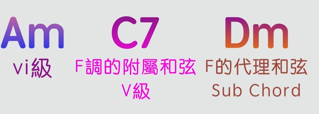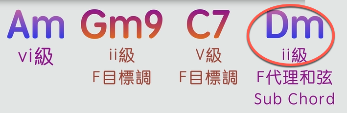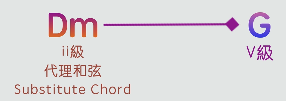 同樣,從F(IV級)去到G(V級)和弦的時候,F和Dm是和弦家族,所以就可以用Dm來代替F和弦,成為代理和弦。
