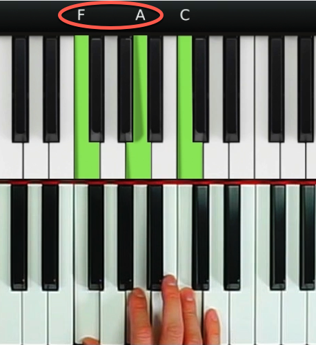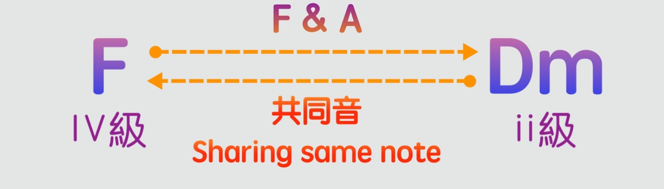 F (IV級) 和 Dm (ii級) 和弦、有兩個共同音:F和A