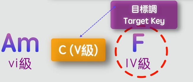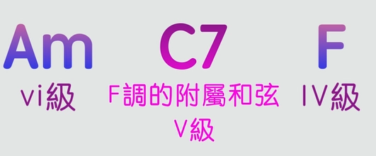 同樣,在Am(vi)去到F(IV)的時候(第四拍),如果我們以F和弦作為目標調,就是F調,那它的五級和弦就是C7附屬和弦,作為過渡和弦來替代F和弦