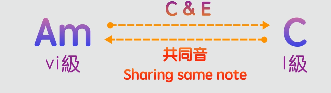 Am (vi級) 和 C (I級) 和弦,有兩個共同音:C和E