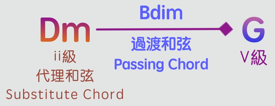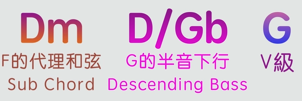 那麼從代理和弦Dm去到最後的G和弦的時候,中間我們可以加入G的半音上行和弦D/Gb,來順利地過渡到G和弦。
